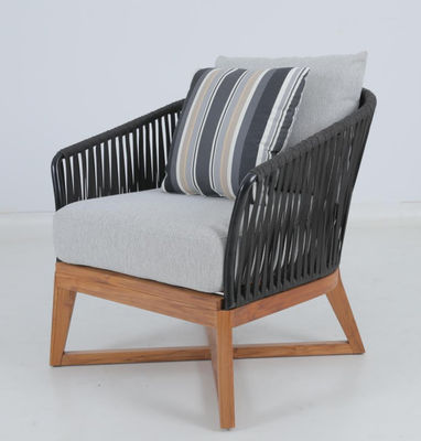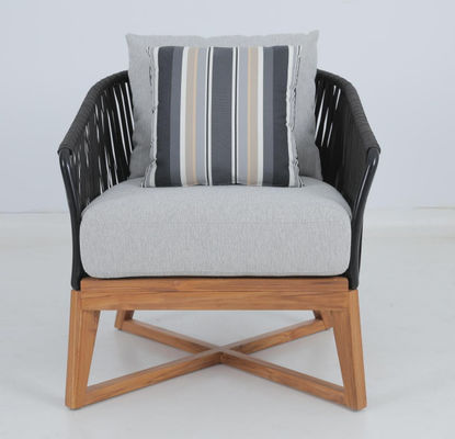 Внешний кресло-лоундж с угловой рамой, обернутой ремнями, твердой тековой основой, подушкой сидения, спинной подушкой и декоративной подушкой.Задние подушки: Край водопада с бейсбольным швом.